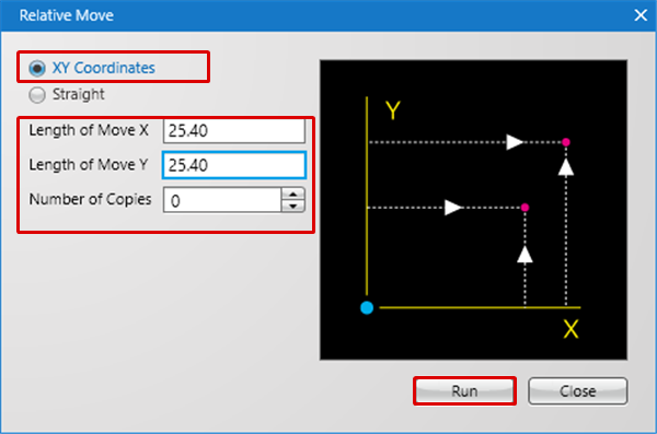 Relative Move (Copy) can be executed by configuring the X Axis and Y Axis Length of Move settings for the selected object.