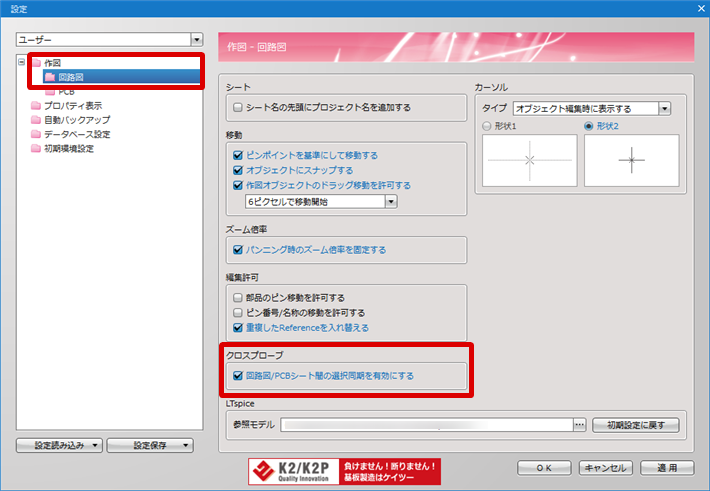 回路図/PCBシート間の選択同期を有効とすることで、回路図及びPCBシートに存在する同一オブジェクトを同期的に選択することが可能です。設定は「環境設定」の「作図:回路図」から、もしくはプロパティウィンドウから有効/無効を切り替えることができます。またこの設定を有効とすることで対象のオブジェクト位置へとパンが可能な「クロスプローブ」のメニューを実行することが可能です。