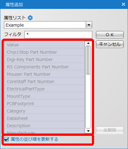 チェックを付けることで、「属性一覧」内の全項目を、並び順も含めて部品に追加することが可能です。 |