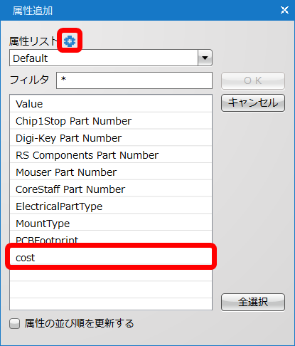 「属性リスト」右側にある『歯車アイコン』にて“部品属性”設定ダイアログを開くことが可能です。