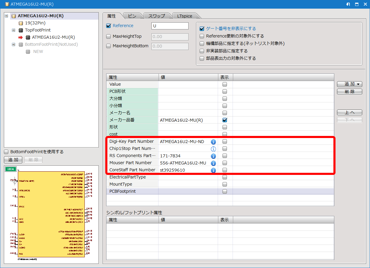 属性は回路図上に表示を行ったり、部品表に出力することができます。