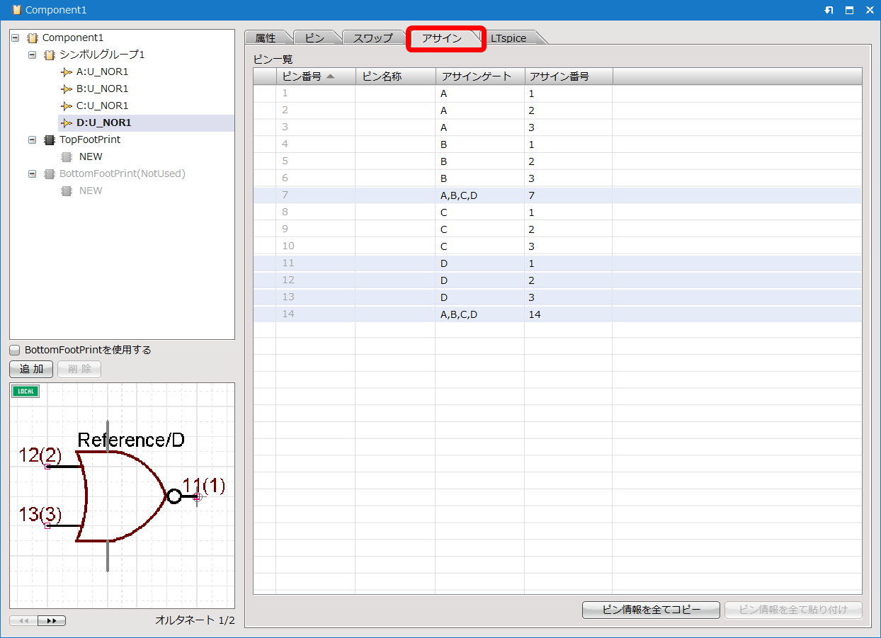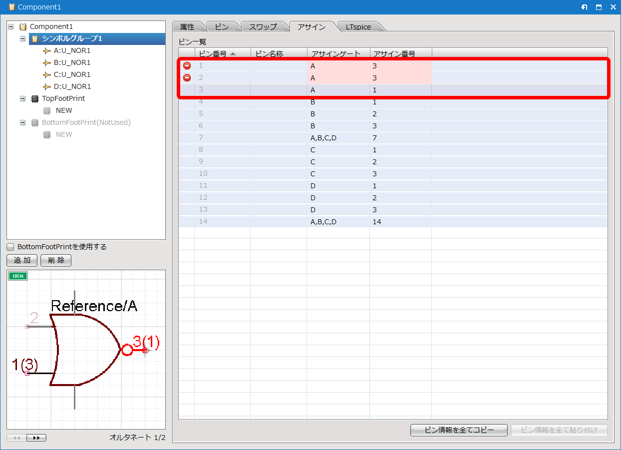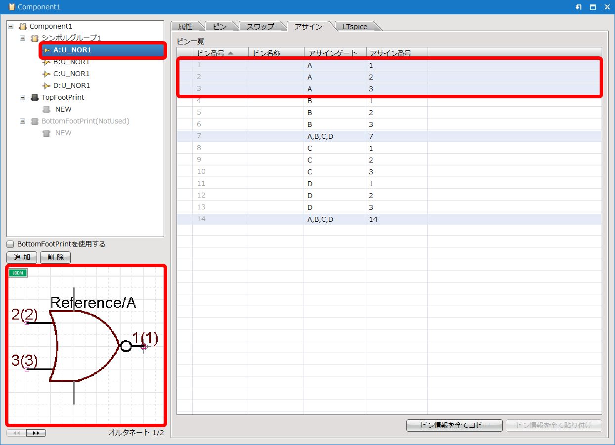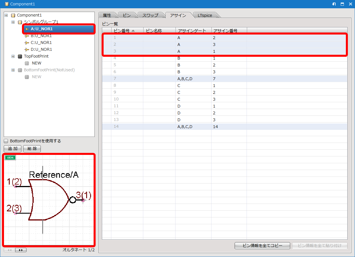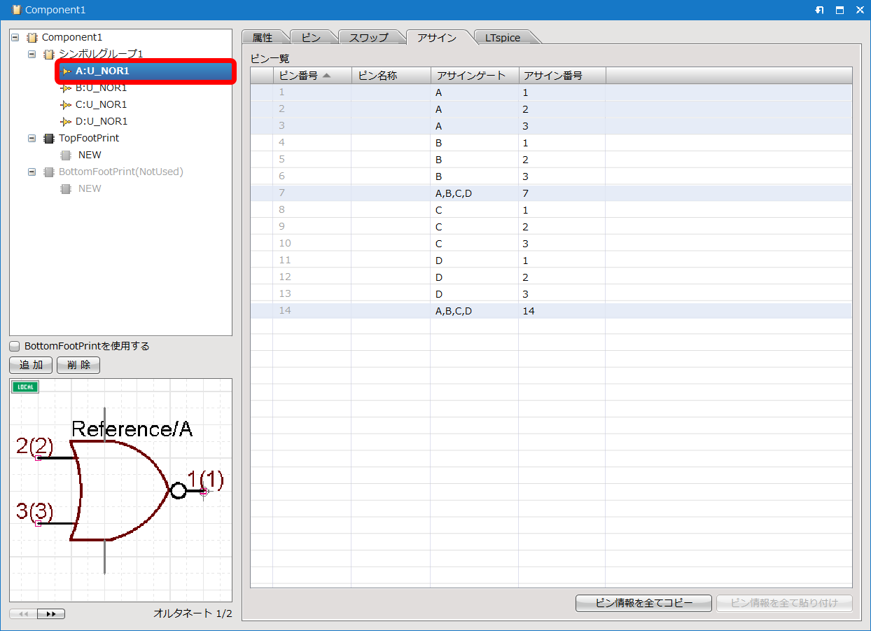 ゲート部品の場合は同じシンボルを使っていてもここでそれぞれのゲートのピン番号をアサインできます。
