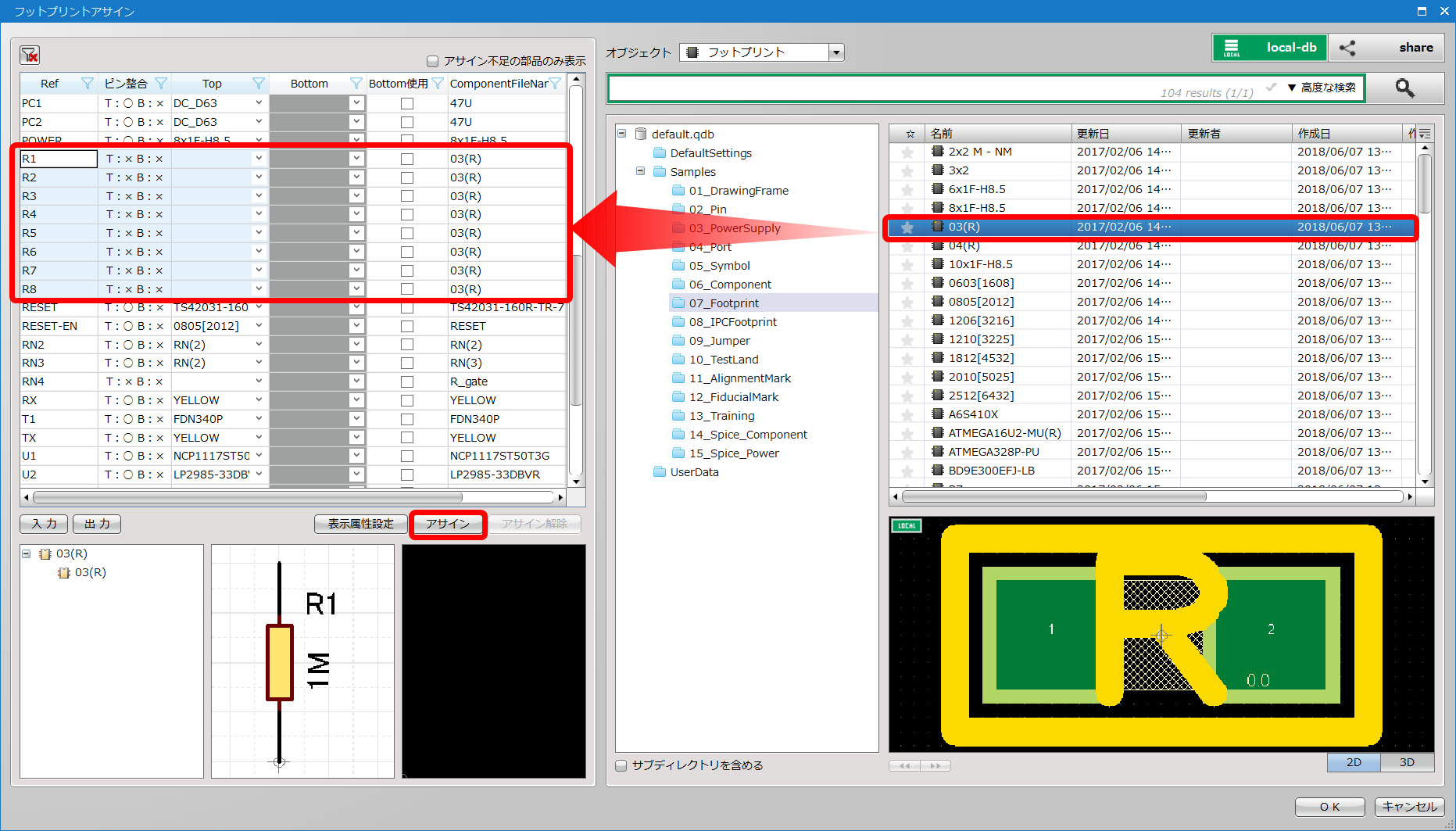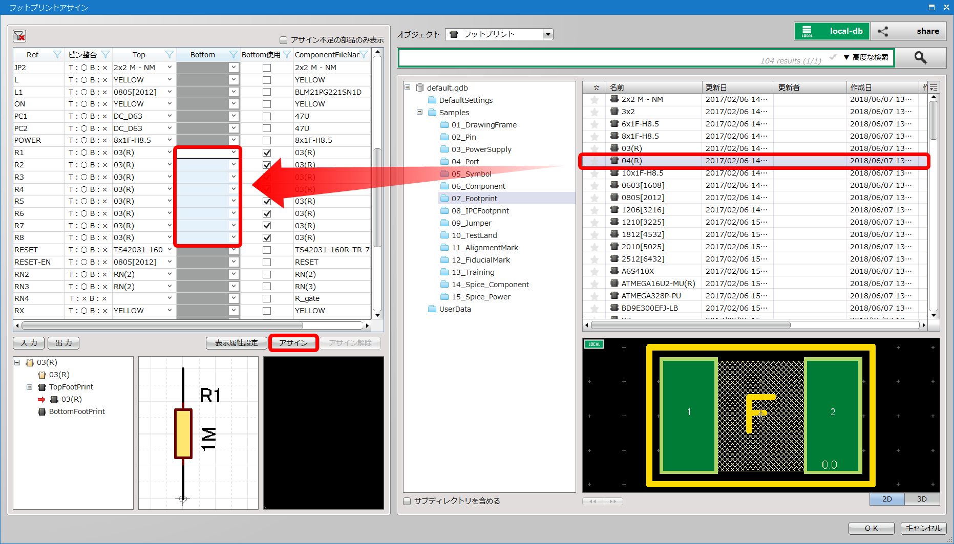 「アサイン」:右側のディレクトリからフットプリントを選んでアサインします。 |