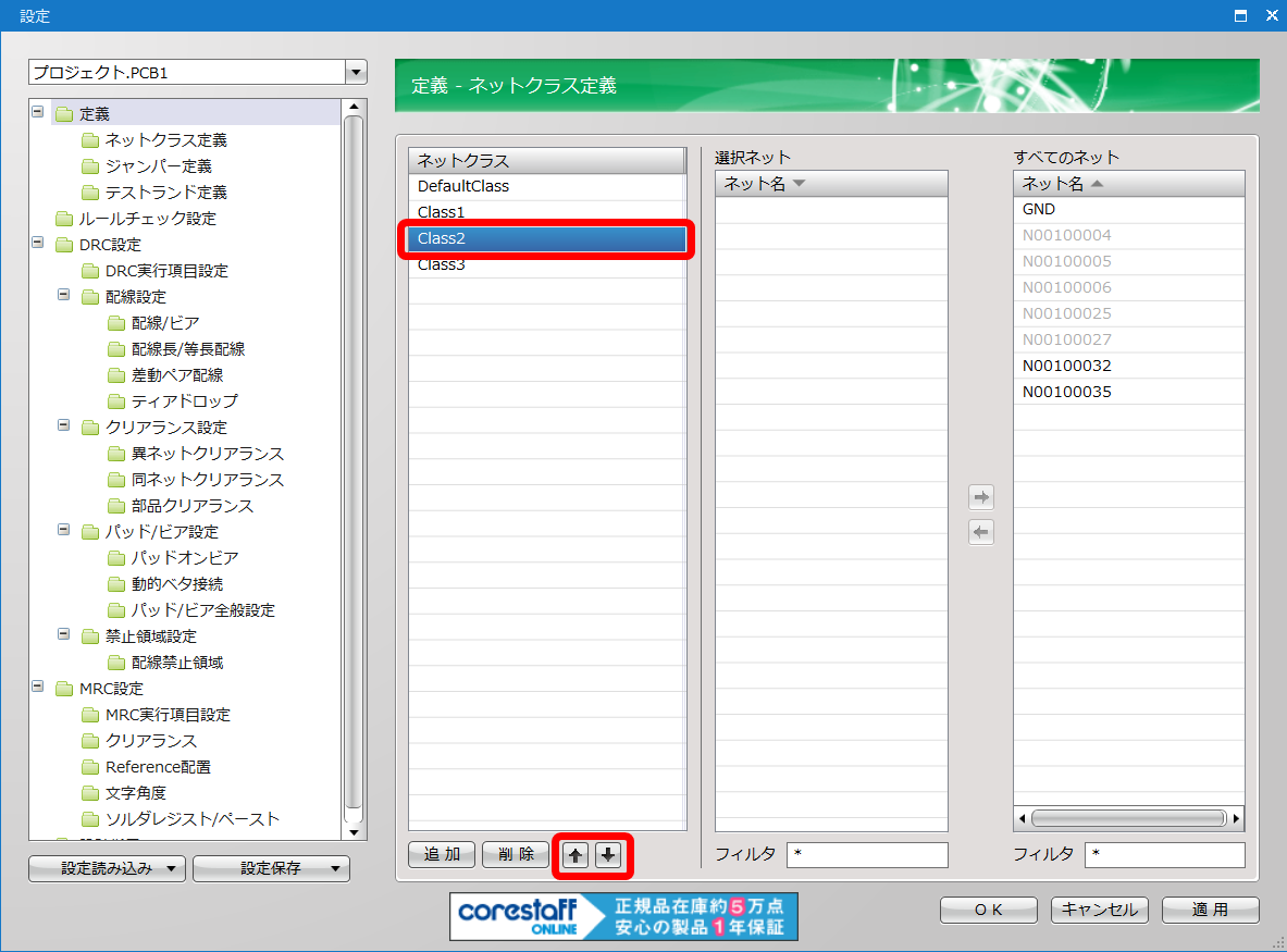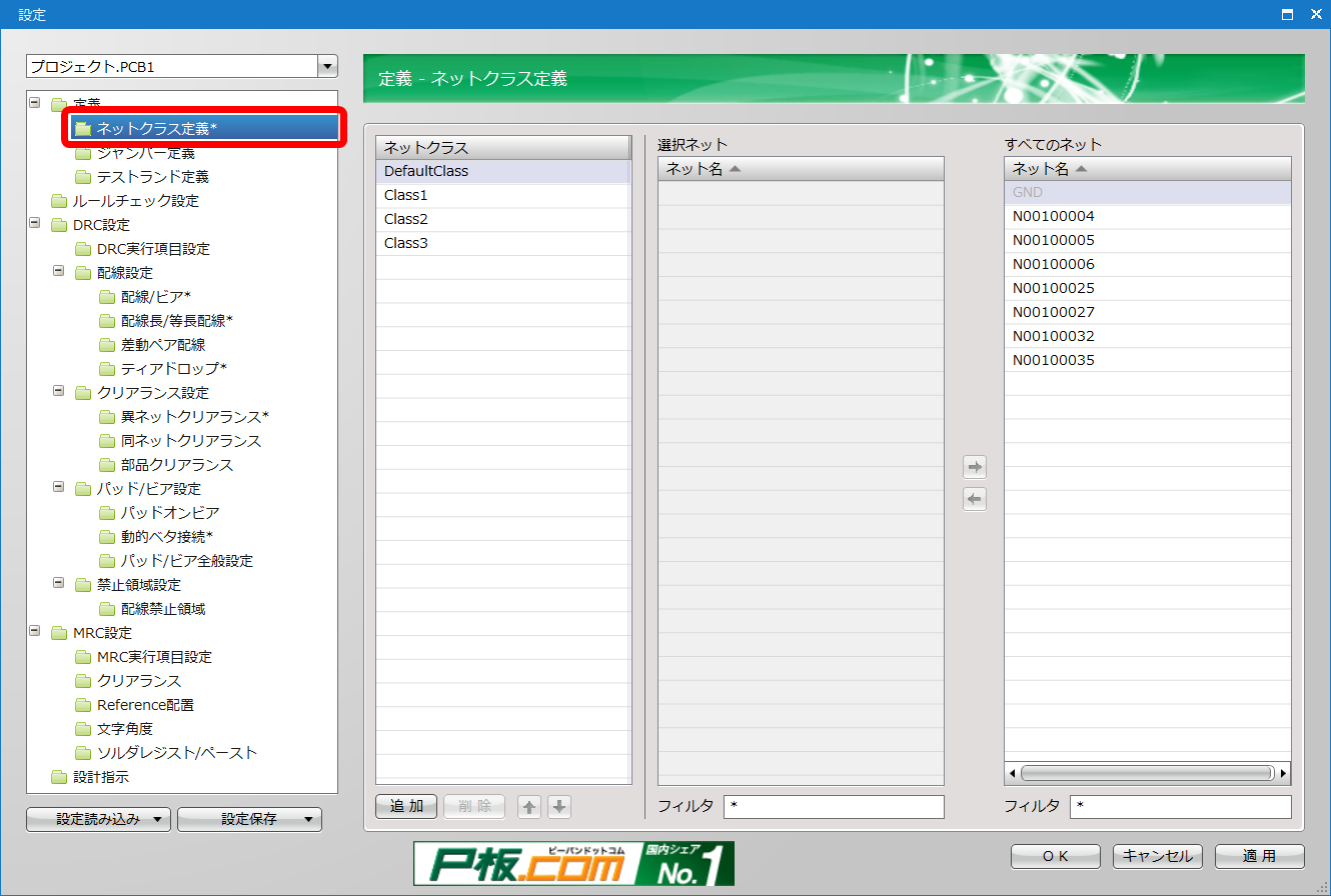 ネットクラスの設定方法は「ネットクラスの設定」を参照してください。 |