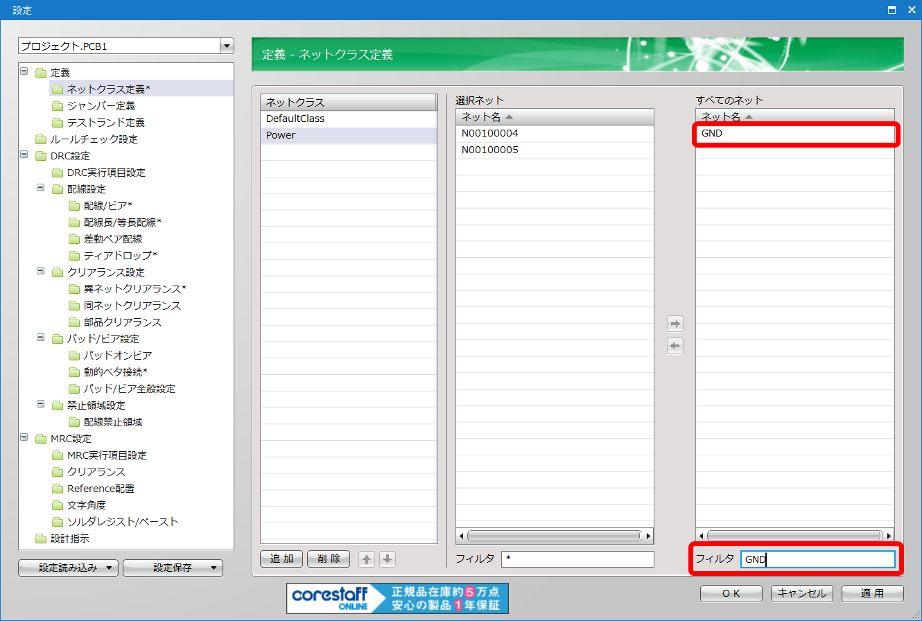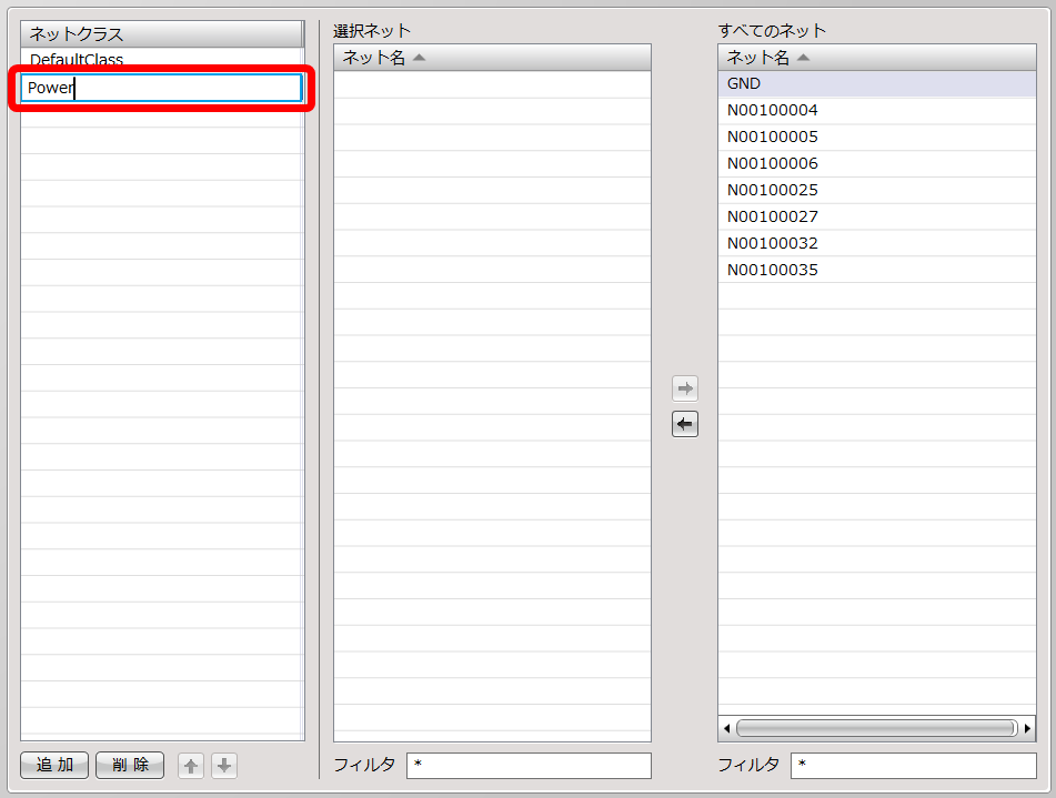 今回は電源関連のネットを「Power」クラスとして設定します。 |