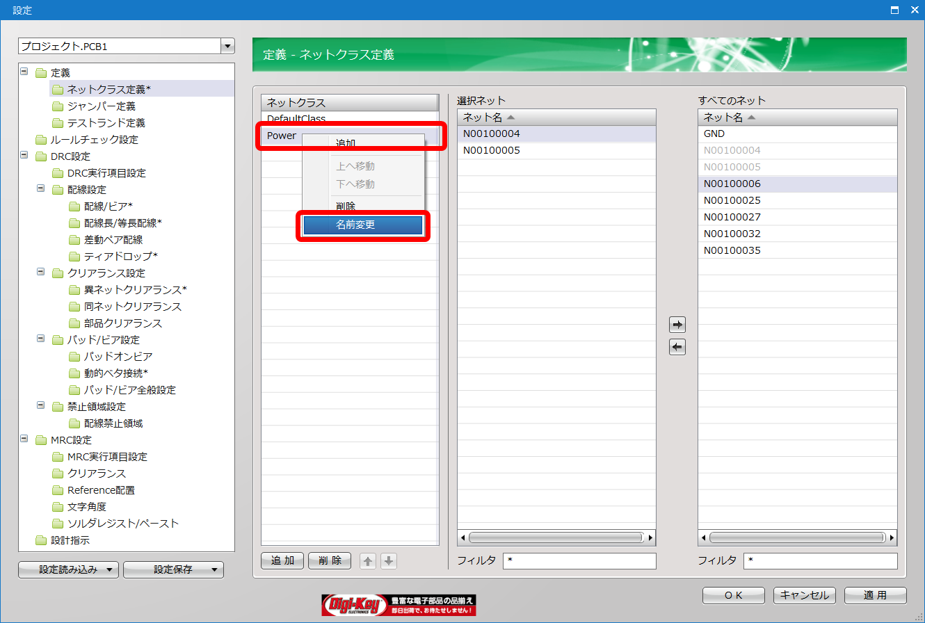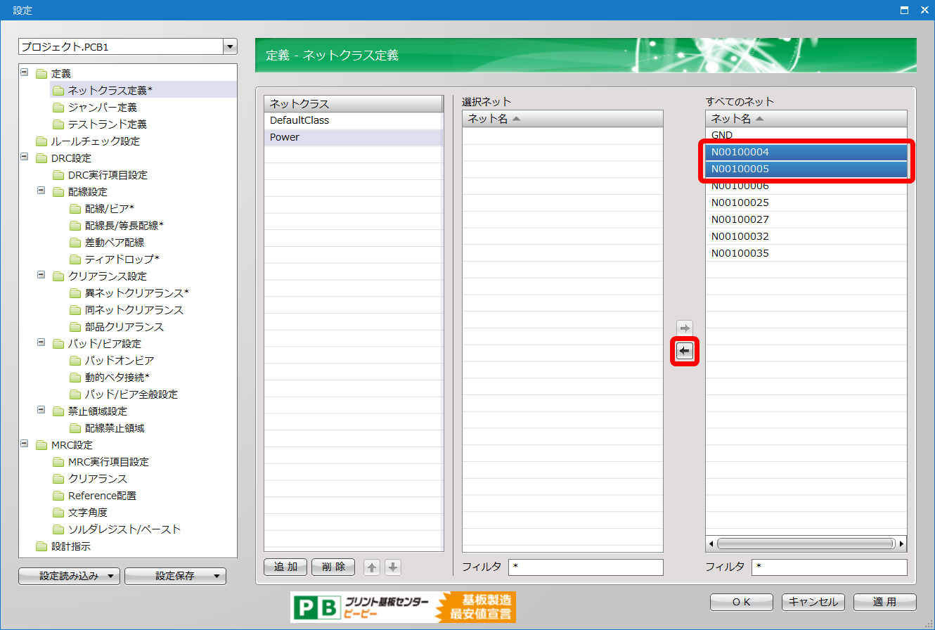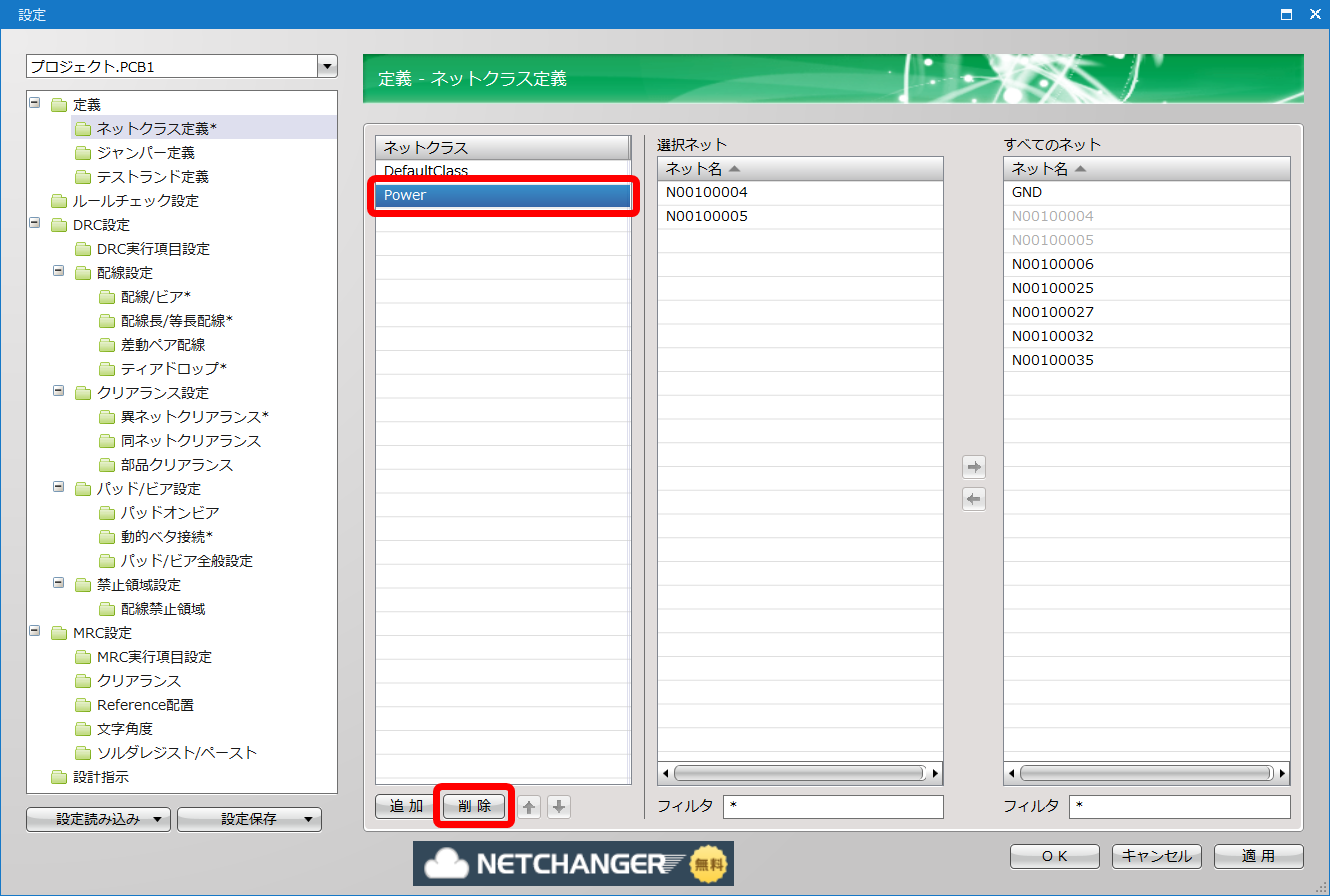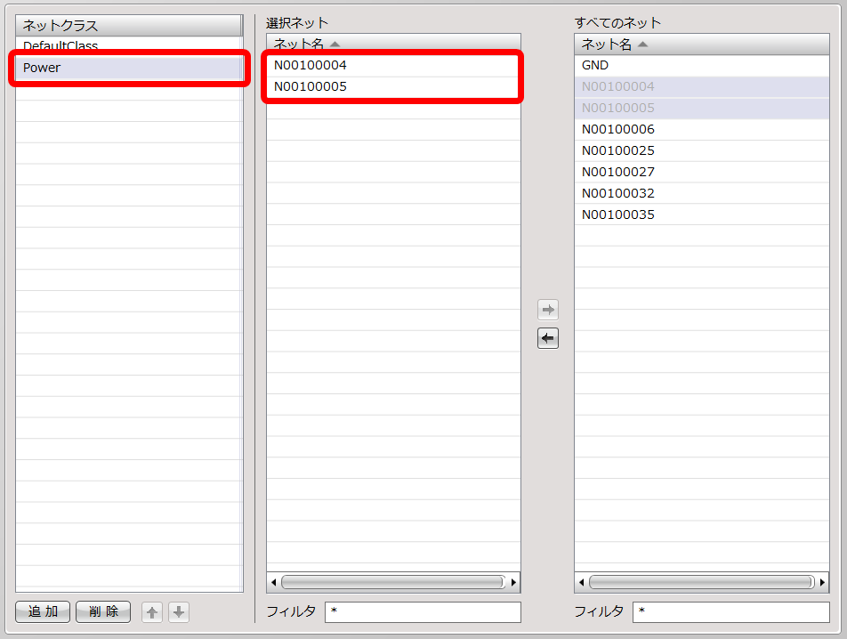 | 「Power」のネットクラスに「N00100004」と「N00100005」のネットが設定されました。 |