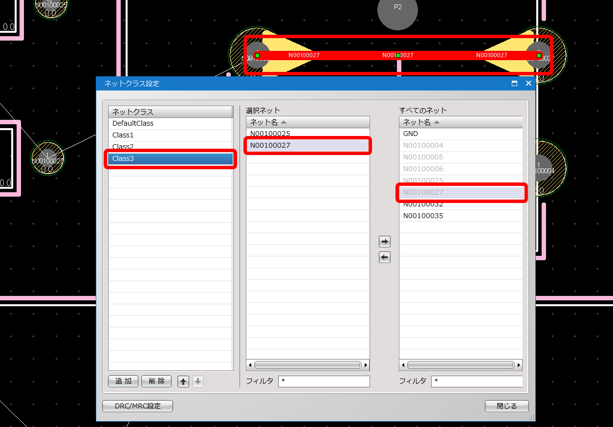 「ネットクラス設定」が開き、選択した配線のネットが「すべてのネット」欄にて選択された状態になっています。