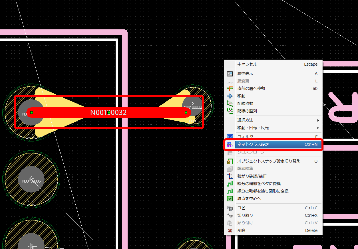 ネットクラスの確認は設計図面中で電気オブジェクトを選択し右クリック→【ネットクラス設定】(ショートカット「Ctrl+N」押下)からも可能です。