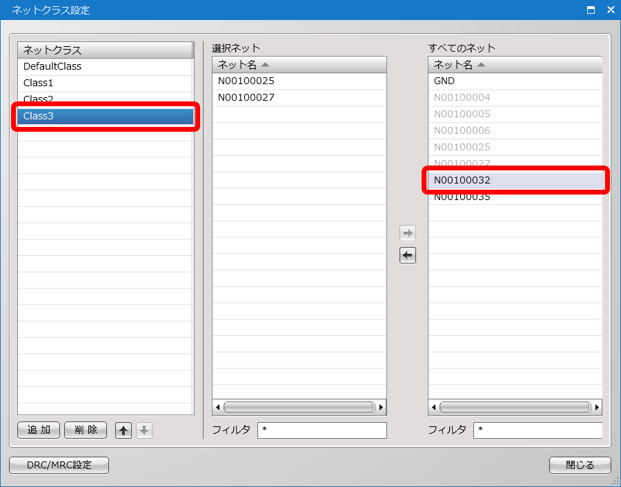 ネットクラス定義とは、DRC/MRCにおいて同じルールを適用するネットをまとめ、クラス分けする設定となります。