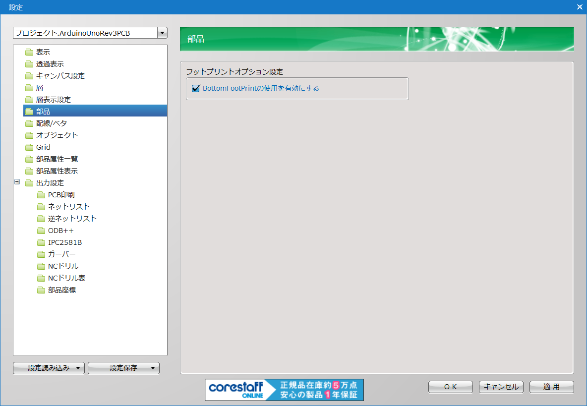 「BottomFootprintの使用を有効にする」のチェックを外す場合、Bottom面にBottomFootprintの形状を使って配置していた部品は、自動的でTopFootPrint形状に切り替わります。