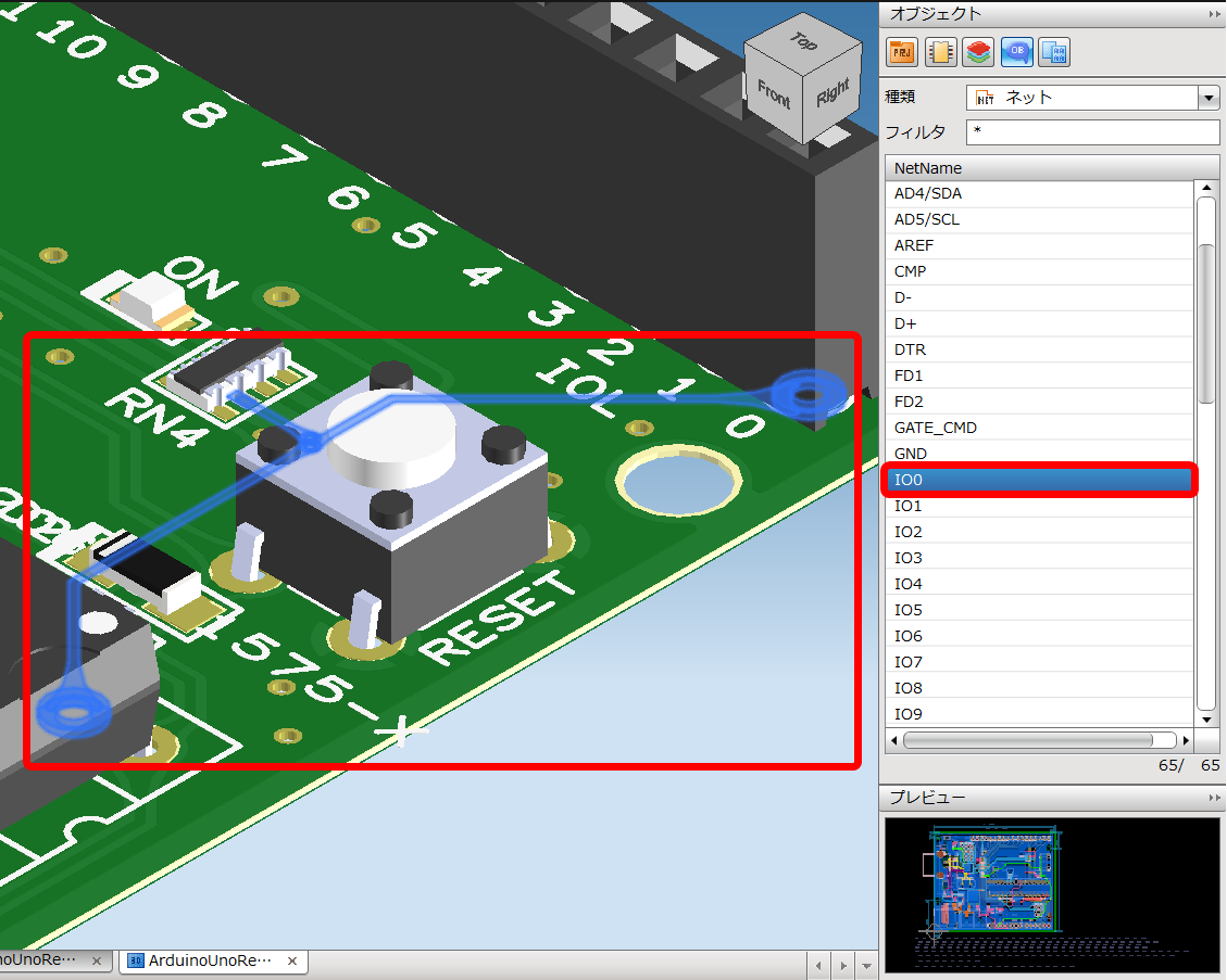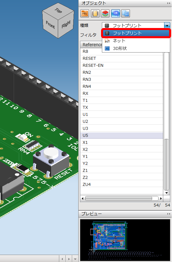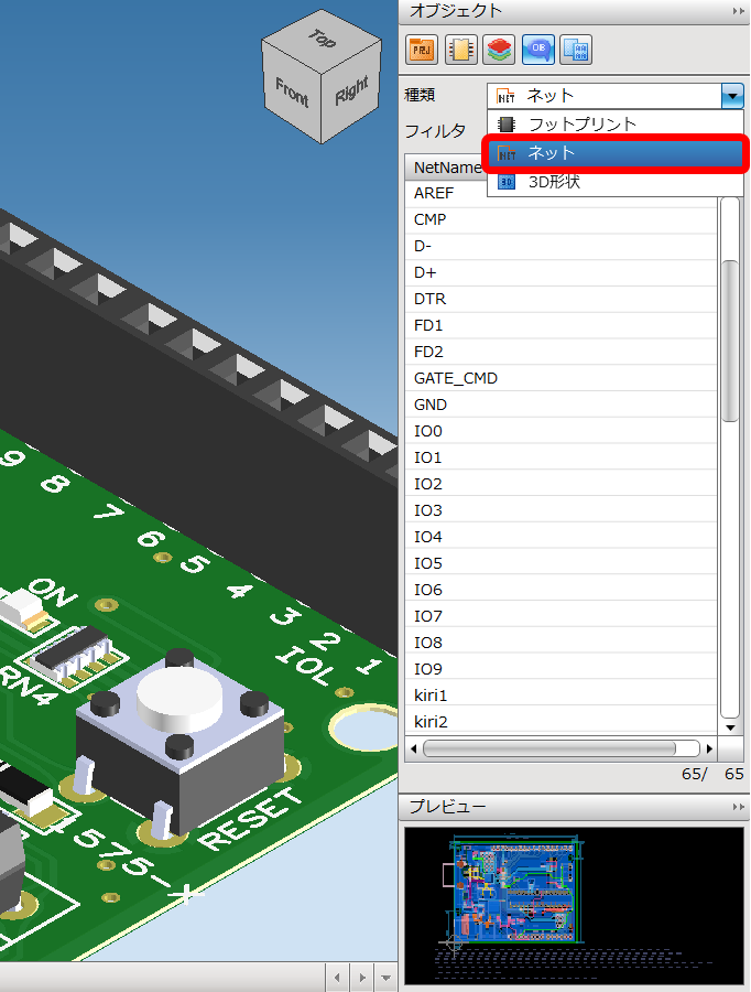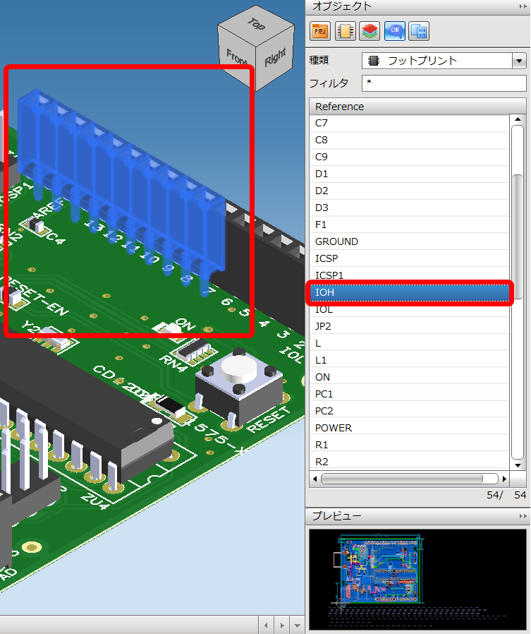 3D描画の画面でオブジェクトウィンドウから配線経路の確認と、部品の3D形状を確認することが出来ます。