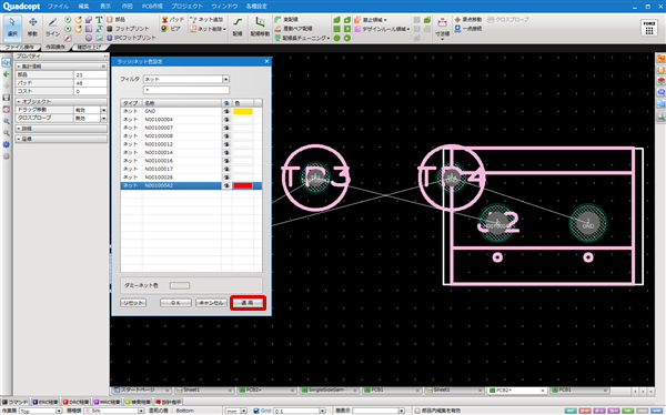 ネットは「Shift」キーや「Ctrl」キーを押しながら選択することで複数選択ができ、複数ネットに対しまとめてネット色の設定ができます。