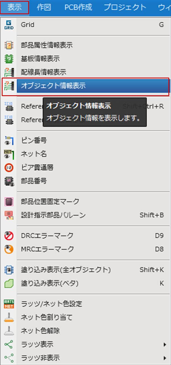 現在は配線情報のみの表示となっております。配線オブジェクトを選択することで配線の長さや配線に接続のあるピン数/ビア数等の情報をネット単位/配線単位で確認することが可能です。