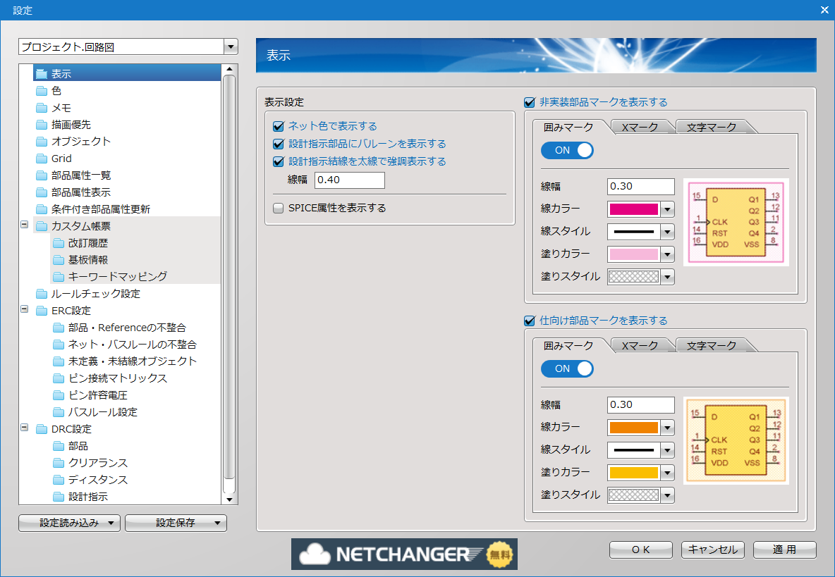 回路図の設定はERC、DRC、各オブジェクトの色やサイズなど、その他にも色々な設定があります。